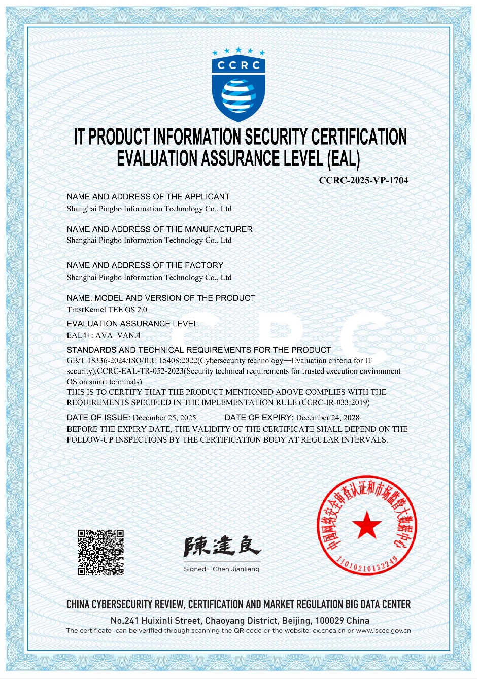TrustKernel TEE OS 2.0, the trusted execution environment operating system, has achieved Common Criteria (CC) EAL4+ certification, confirming that it meets internationally recognized high-assurance security requirements. The certification validates TrustKernel TEE OS 2.0 across key dimensions including security architecture design, implementation quality, resistance to attack, and lifecycle security processes.